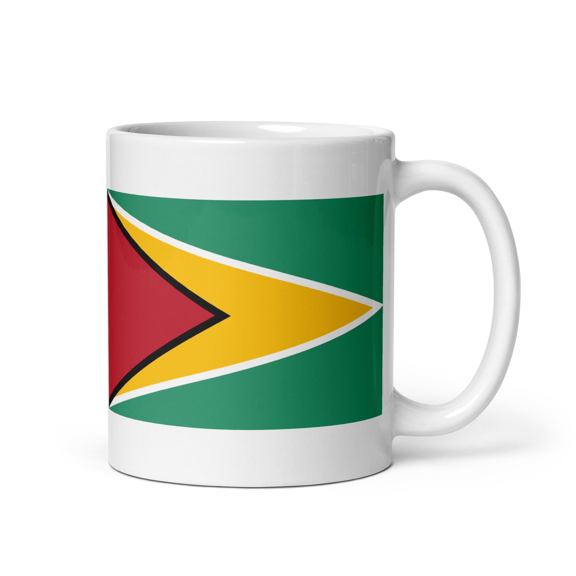 Our Guyana Flag Coffee Mug captures the courage and optimism of this remarkable country. The red triangle symbolizes strength and zeal, the gold arrowhead reflects the nation's mineral wealth, the green background honors its lush forests, and the black and white lines represent endurance and purity.